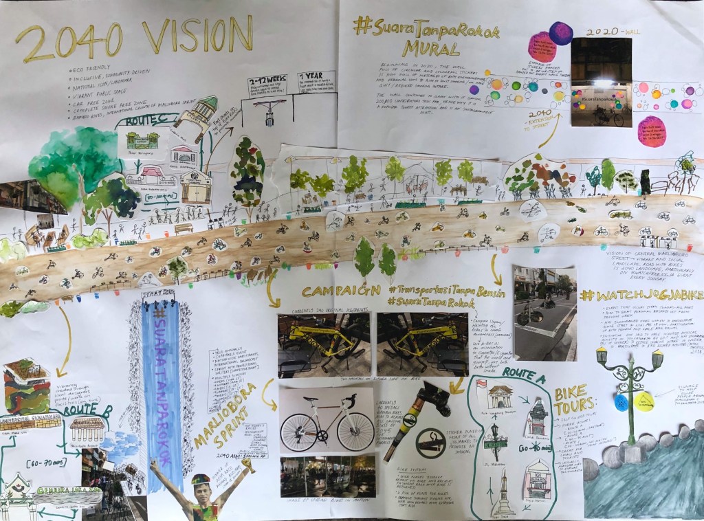 In 2040, Malioboro street is a nation-wide success story in the wicked fight against tobacco. It is an eco-friendly, vibrant public space created through its socially diverse landscape of music, art and bicycle initiatives. The entire area is a complete smoke free zone as well as motor free zone thanks to the campaign #SuaraTanpaRokok and #TransportasiTanpaBensin.